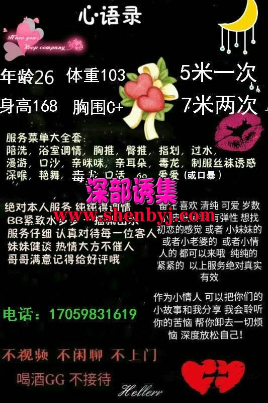 妹子自己租房,干净整洁,人比较健谈。服务做的认真不机车,一口一个亲爱的,舌头灵活,毒龙一绝。 ...